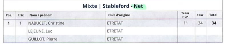 RESULTATS DE LA DERNIERE COMPETITION NET